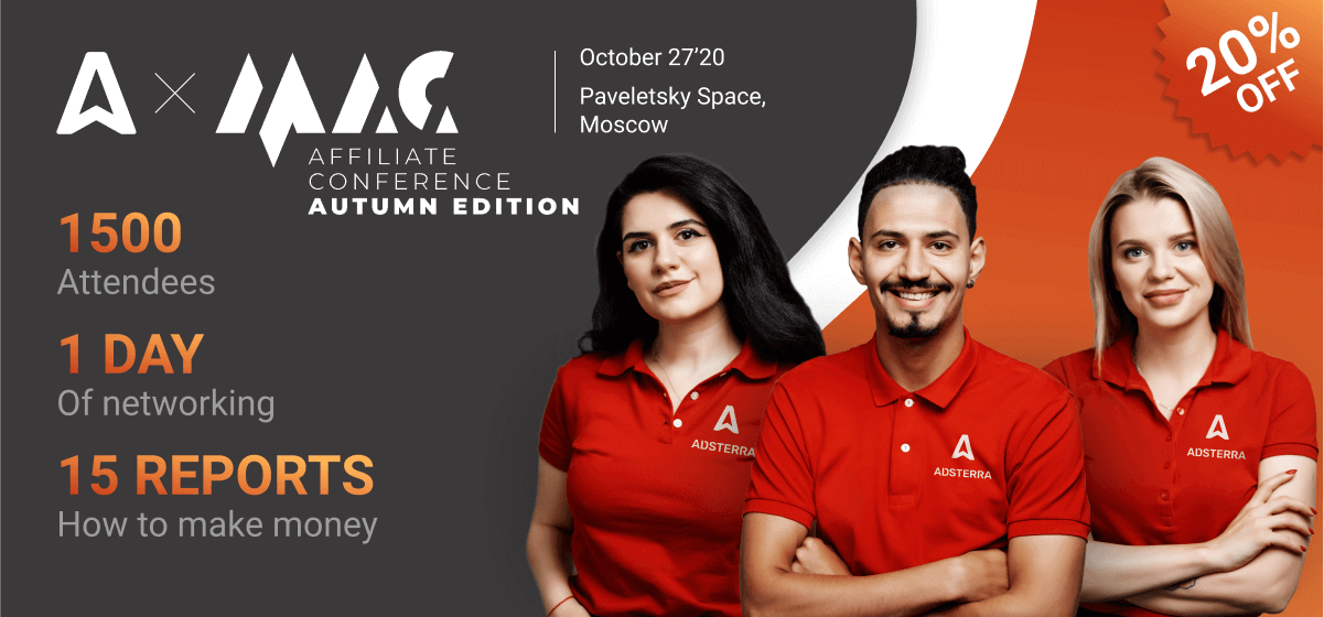 We can’t wait to meet you and have prepared a bonus. If you register as an affiliate before October 26th, you can get a 20% OFF on Gold or VIP tickets. Just type in the word Adsterra as your promo code.