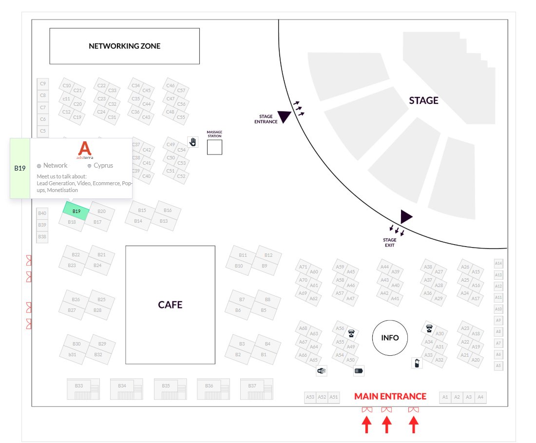 Adsterra team will be waiting for you at Booth B19, located at the convenient proximity of the cafe and the stage: