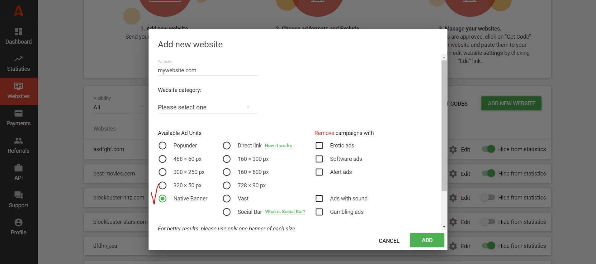 You may have added several domains to the Adsterra platform, but there were no native banners there. You can easily place them on one of the previously approved websites!
