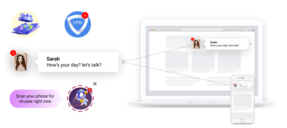 Ad creatives look like native notifications, widgets, icons, chats, but they won’t be blocked by browsers.