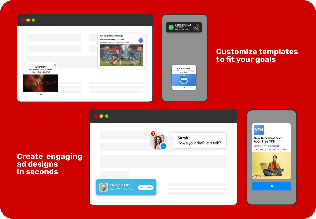 You can now empower your ads look exactly like notifications sent by top mobile OS: friendly, neat, and attention-grabbing. Making your offer look credible from the start is a secret power, isn’t it?