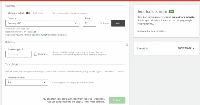 Estimator makes a forecast on how much traffic you will get for the campaign based on your settings, bids and current competition within the market. Estimator works for all ad units, for both CPM and CPC campaigns.
