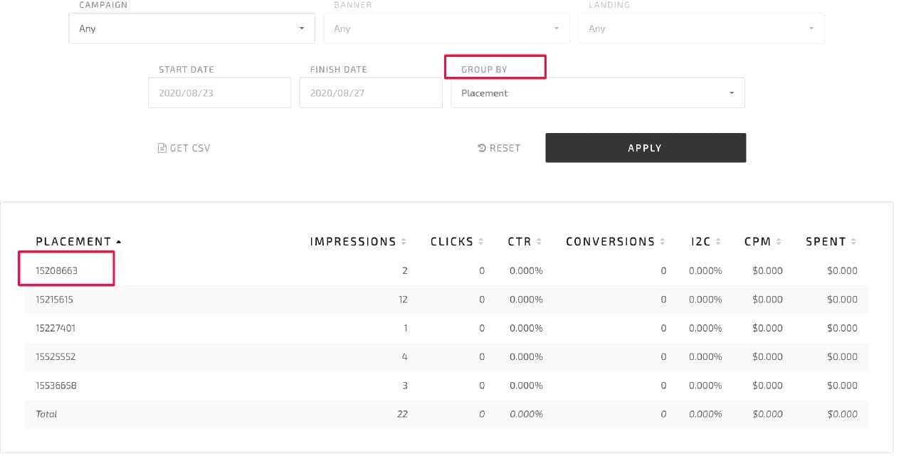 On your Statistics tab, you see granular data on how various publishers run your ads. Placements IDs are on the left.