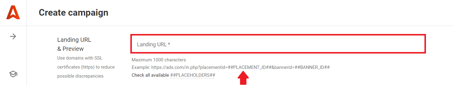 Before getting started with custom bids, let’s see how to mark all placements to track their efficiency. While setting up your next campaign at Adsterra, you’ll need to prepare your landing page URL for tracking placement IDs. You need to the include Adsterra tracking token ##PLACEMENT_ID## to your landing page URL.