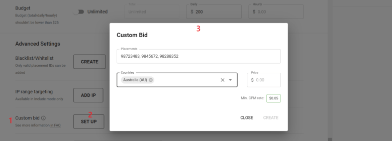 Paste placement IDs that you are sure will perform great with your settings and enter the country codes. In the tooltip, you’ll see the minimum bid for the countries you entered. Your custom bid can’t be lower than the minimum rate. Enter your custom bid and click Add.