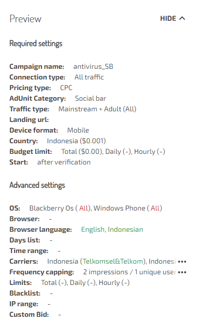 As a result, we have a target on all OS except Blackberry, IOS and WP (most of the traffic is on Android), CPC pricing, mainstream+adult traffic, mobile devices, ID GEO, Indonesian+English languages, with operators specified in the offer.