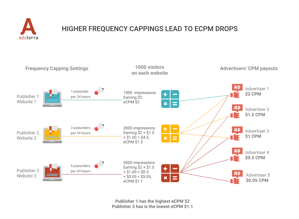 Publisher #1 will have 1000 impressions and earn $2 with eCPM of $2. Why? Because this publisher has shown popunder in 24 hours. His earnings have come exceptionally from Advertiser #1.