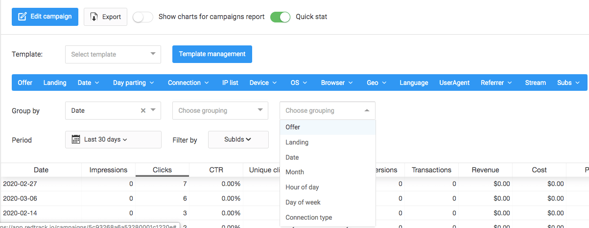Inside RedTrack you can add, hide, and reorder all the available columns and metrics and analyze the dynamics of your traffic effectiveness through an adequate period of time. If you regularly work with several Traffic Sources, niches and targeting options, you most likely will need to customize your dashboards every time you switch between them. No need to do it. Just save the report template and reuse it every time you start out a new advertising campaign.
