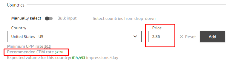 ❌ Set too concrete and limited targeting combined with the minimal/recommended price. Thus you lose the opportunity to get a representative traffic test result: low price + narrow targeting options = poor traffic volume. Besides, with such low volumes and tight targeting, you wouldn’t see the full picture and miss the high-converting targeting combinations or even that one source that performs best for your campaign indeed.
