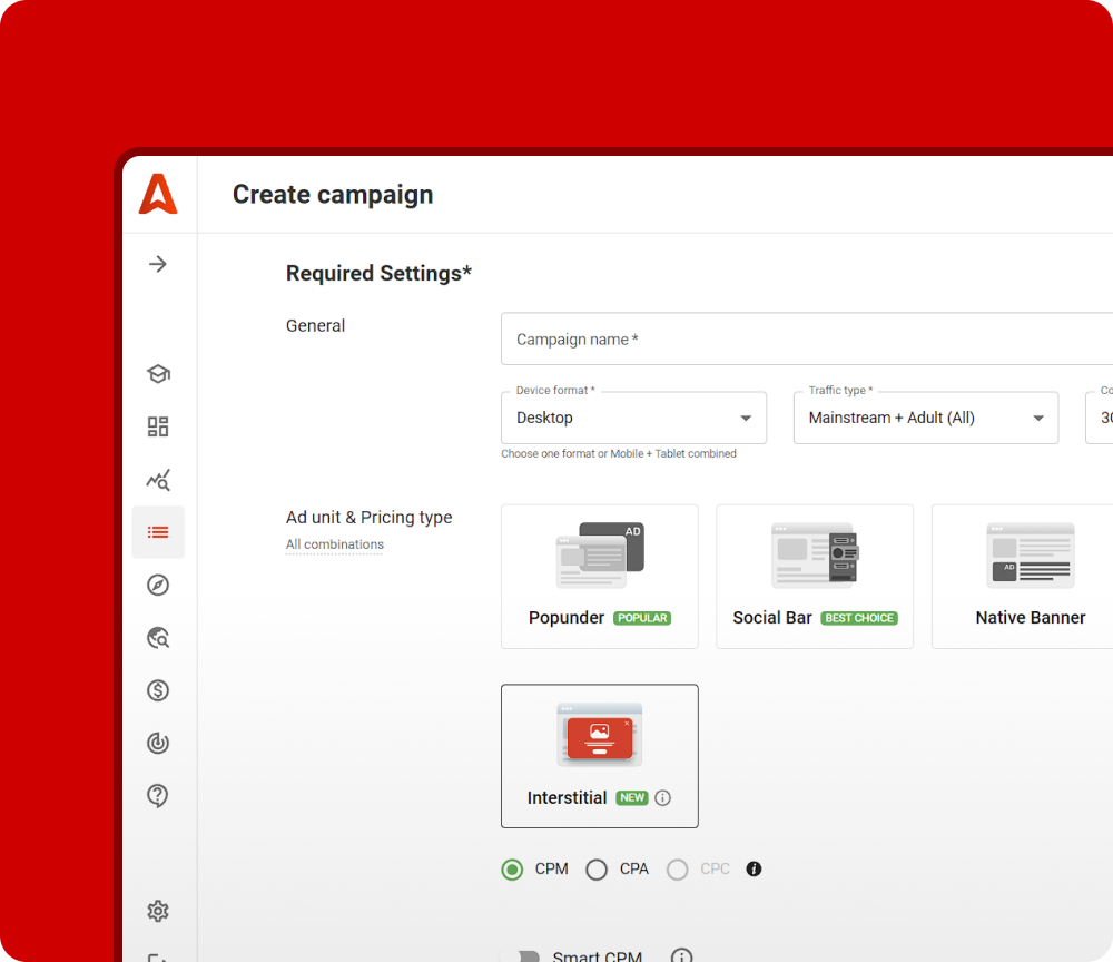 Interstitial ads are highly visible, impossible-to-ignore ads that overlay the web page right on top of a website, taking up to 80% of the screen space. Adsterra now offers new templates of Interstitial ads for self-serve advertisers’ accounts.