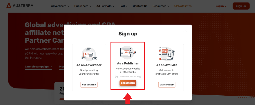 1. To access all Adsterra ad formats, please, sign up or log in as a publisher. When signing up, you will need to verify your email before your account is created.