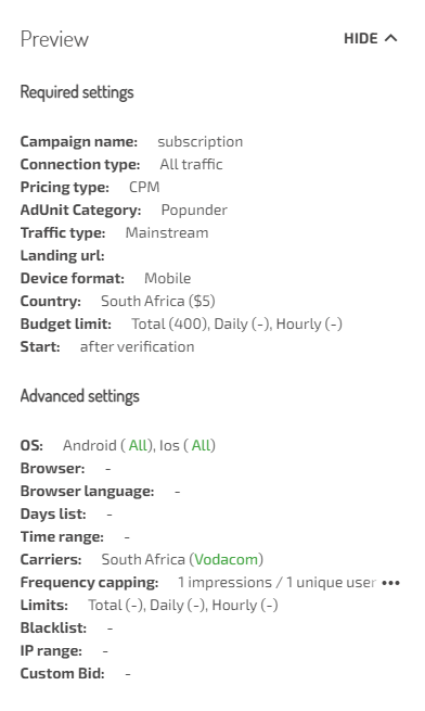 So, all in all we have: Android and iOS targeting, mainstream traffic, mobile devices, carrier — Vodacom.