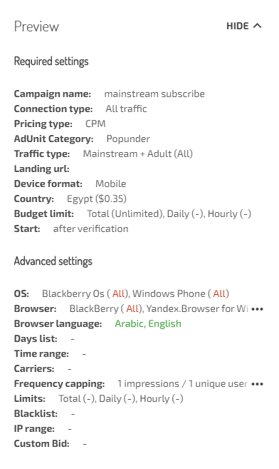 Don’t forget to blacklist worst performing placements in CPM campaigns. I usually google major bot sites for certain GEO and blacklist them right away. It is an essential thing for saving your funds, too!